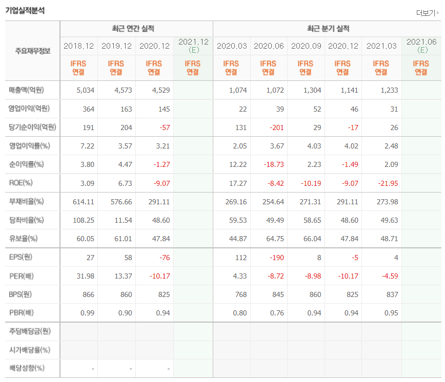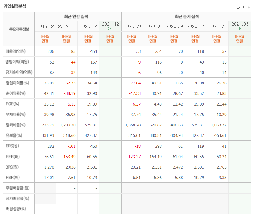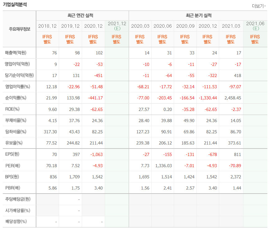 - 2021년 3월 전년동기 대비 별도기준 매출액은 21.5% 증가, 영업손실은 72.9% 증가, 당기순이익 흑자전환.