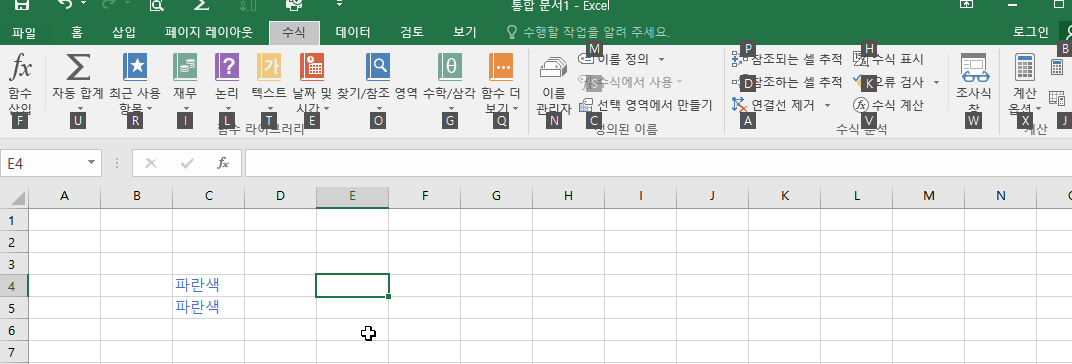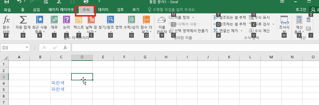 수식 탭으로 이동이 되며, 역시나 수식 탭에 기능을 사용할 수 있는 단축키가 표시되고, 단축키를 누르면 기능이 실행 됩니다.