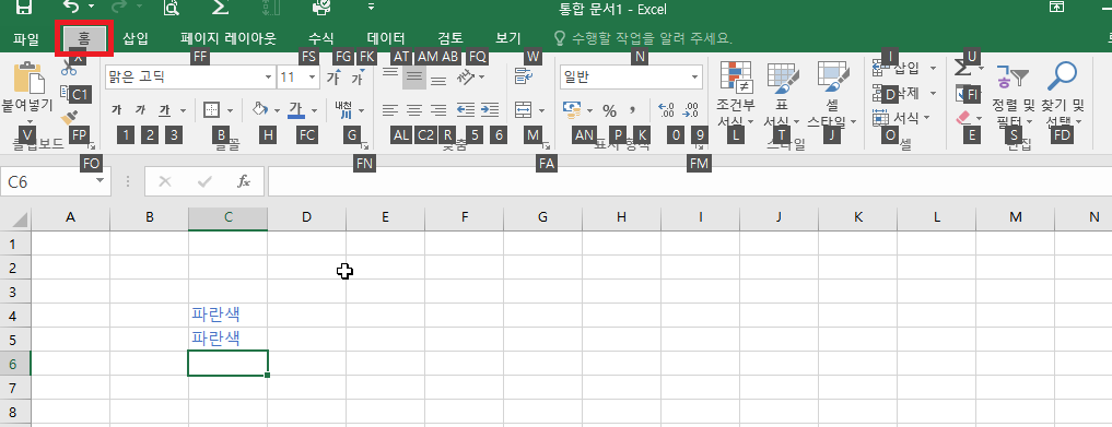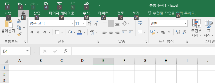 홈 탭으로 이동이 되며, 이어서 홈 탭에 기능을 사용할 수 있는 단축키를 표시해줍니다. 단축키를 누르면 해당 기능이 실행됩니다.