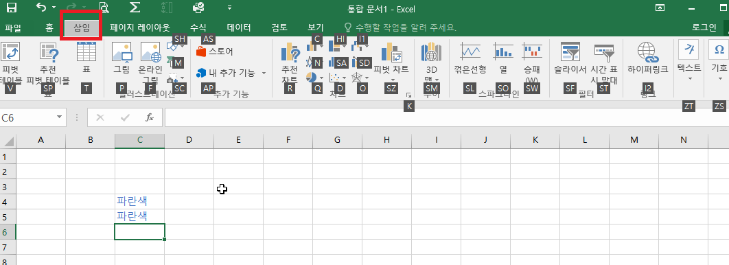 삽입 탭으로 이동이 되며, 역시나 삽입 탭에 기능을 사용할 수 있는 단축키가 표시되고, 단축키를 누르면 기능이 실행 됩니다.