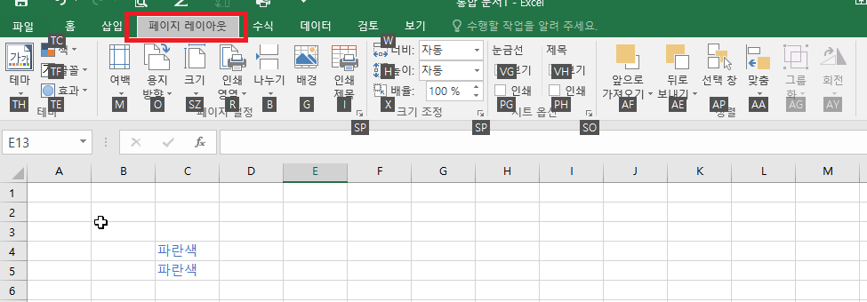 페이지 레이아웃 탭으로 이동 ( ALT + P )