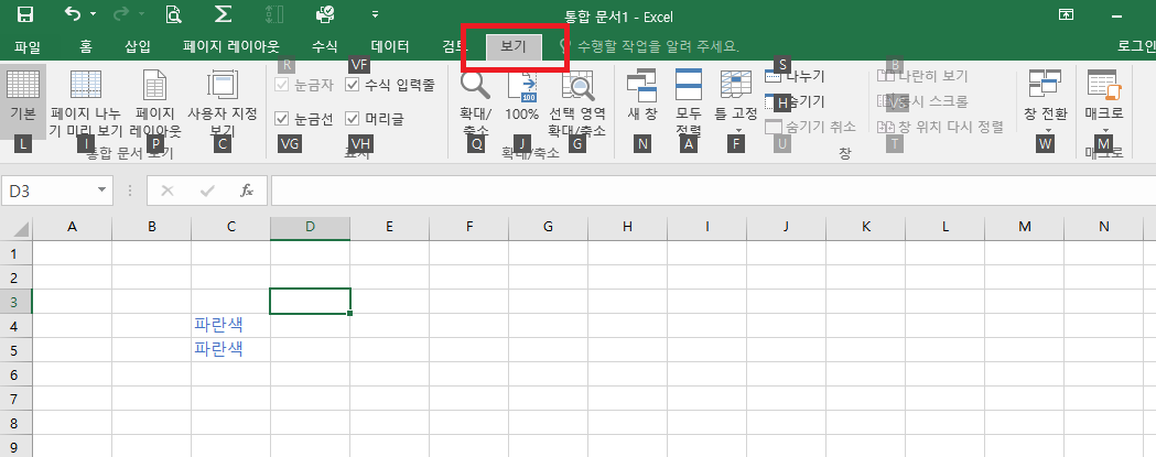 F10을 눌러보시면 리본메뉴에, 단축키가 표시되는걸 확인하실 수 있습니다. F10을 누른 상태에서 표시된 단축키를 누르시면 해당 메뉴가 선택이 됩니다.