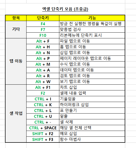 오늘은 엑셀 단축키 모음에 대해서 알아보겠습니다. 혹시나 초급적인 기본적인 단축키 모음을 원하신다면 제가 작성한 엑셀 단축키 모음1을 참고하시면 되겠습니다.