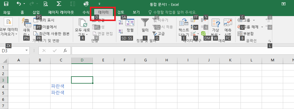 데이터 탭으로 이동이 되며, 역시나 데이터 탭에 기능을 사용할 수 있는 단축키가 표시되고, 단축키를 누르면 기능이 실행 됩니다.