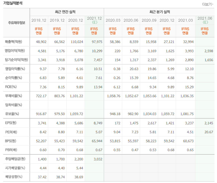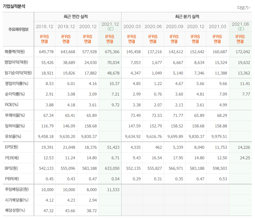 - 2021년 3월 전년동기 대비 연결기준 영업이익 1717.4% 증가, 당기순이익 1776.4% 증가.