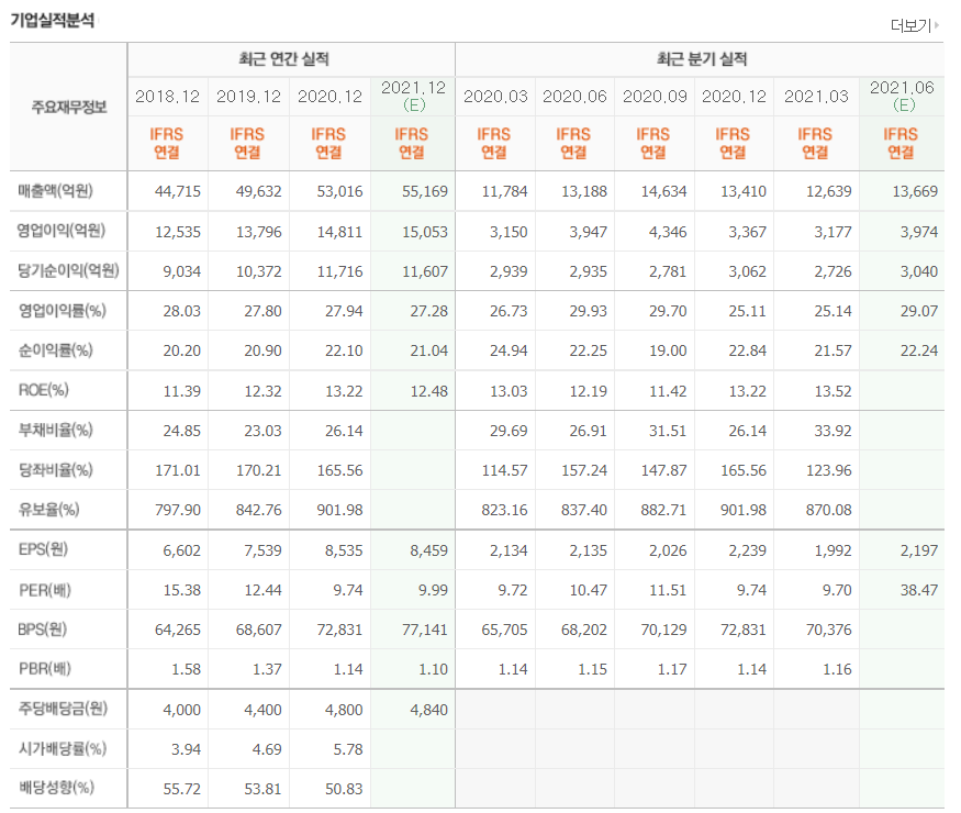 - 2021년 3월 전년동기 대비 연결기준 매출액은 7.3% 증가, 영업이익은 1% 증가, 당기순이익은 6.5% 감소.
