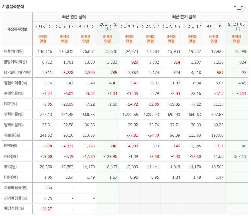 - 2021년 3월 전년동기 대비 연결기준 매출액은 24.7% 감소, 영업이익 흑자전환, 당기순손실은 92.7% 감소.