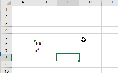 문자인 경우는 텍스트형태로 인식하여, 제곱을 바로 표시가 잘되지만 숫자만 인경우는 숫자로 인식하여, 일부 숫자만 제곱으로 표현이 되지 않습니다. 그럼 되도록 하는 방법으로 알아보죠. 100에 제곱을 표시해보겠습니다.