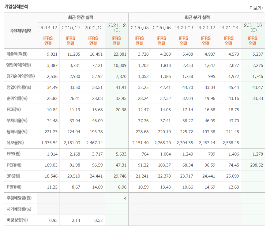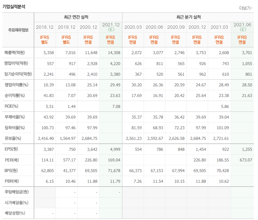 - 2021년 3월 전년동기 대비 별도기준 매출액은 27.8% 증가, 영업이익은 86.3% 증가, 당기순이익은 121% 증가.