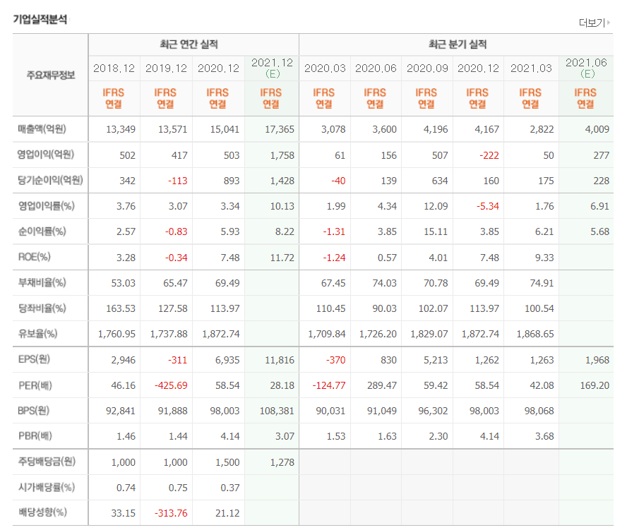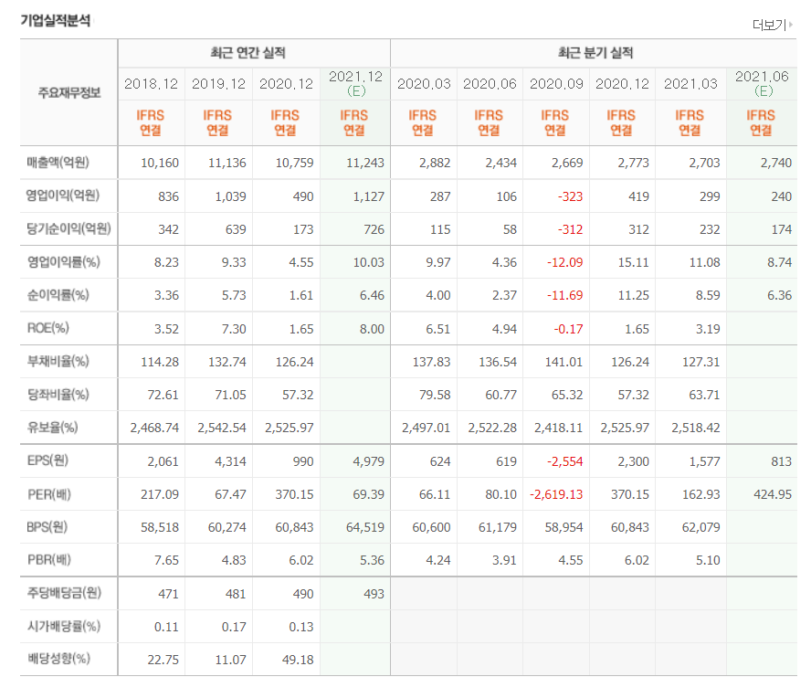 - 2021년 3월 전년동기 대비 연결기준 매출액은 8.3% 감소, 영업이익은 18.8% 감소, 당기순이익 흑자전환.