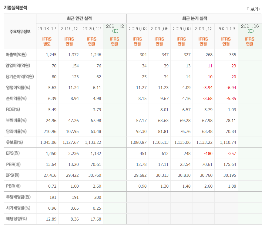 - 동사의 2021년 1분기 총자산은 2,950억원이며 매출액 335억원 및 영업손실 23억원을 기록하였음.