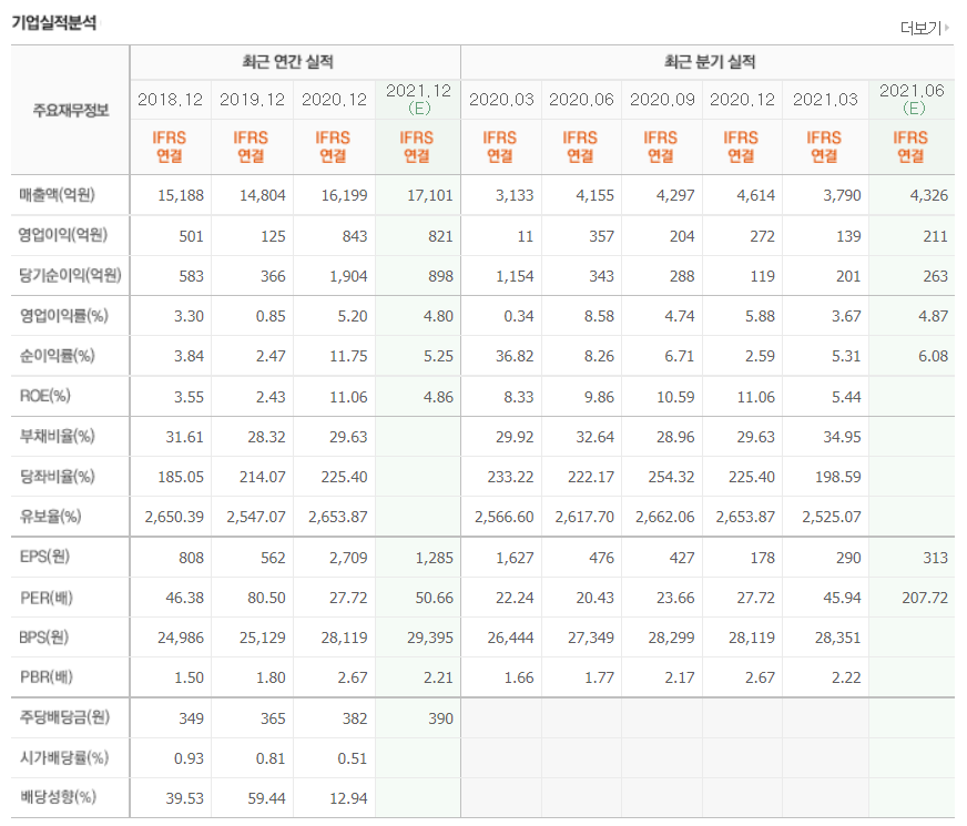 - 2021년 3월 전년동기 대비 연결기준 매출액은 0.2% 감소, 영업이익은 43.6% 감소, 당기순이익은 58.6% 감소.