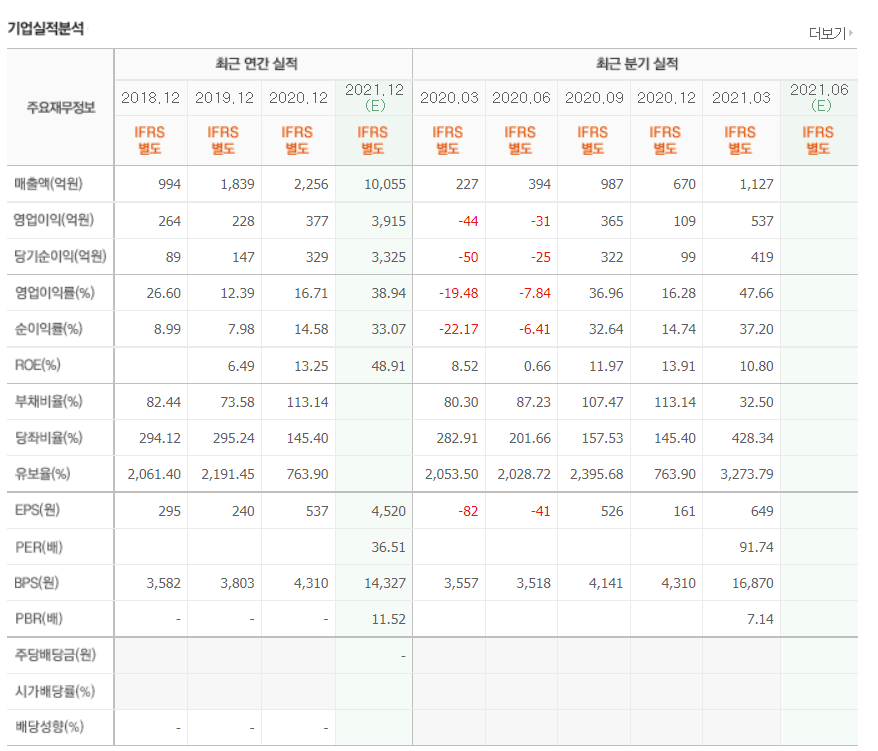 - 2021년 3월 전년동기 대비 별도기준 매출액은 422.4% 증가, 영업이익 흑자전환, 당기순이익 흑자전환.