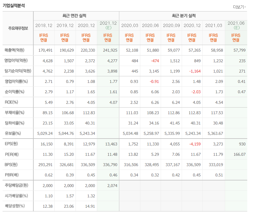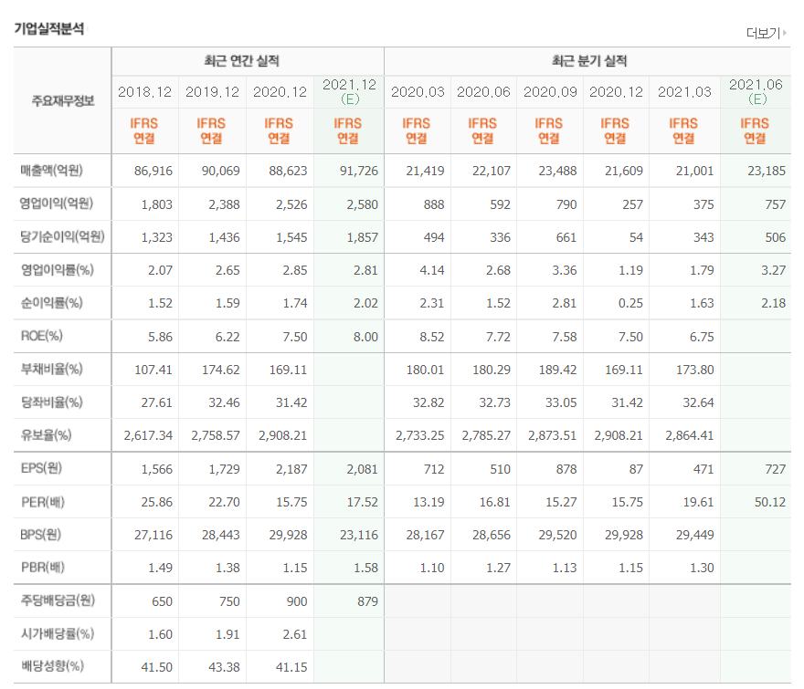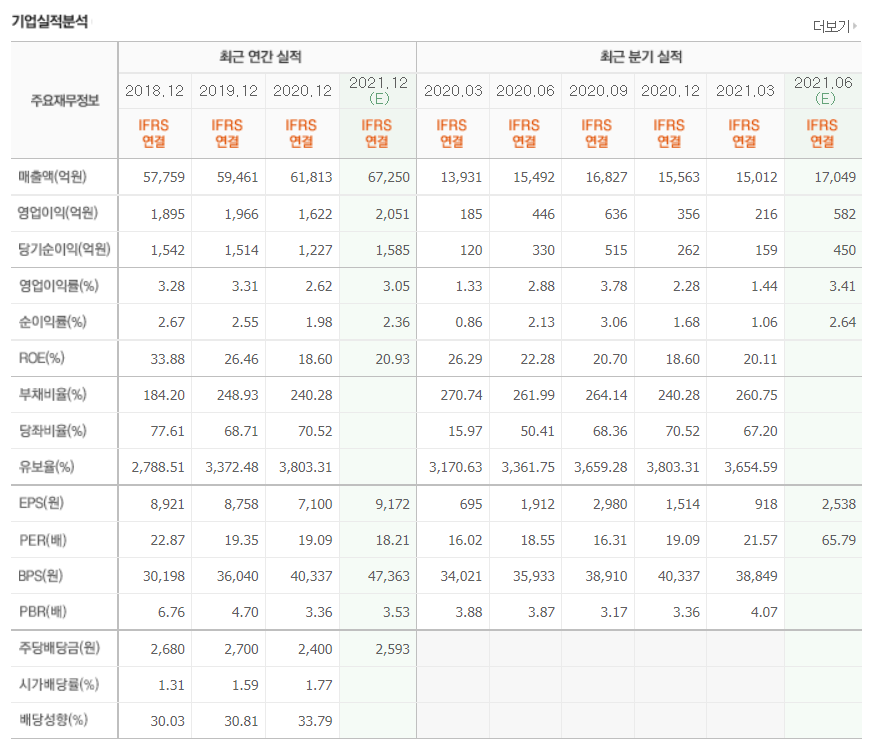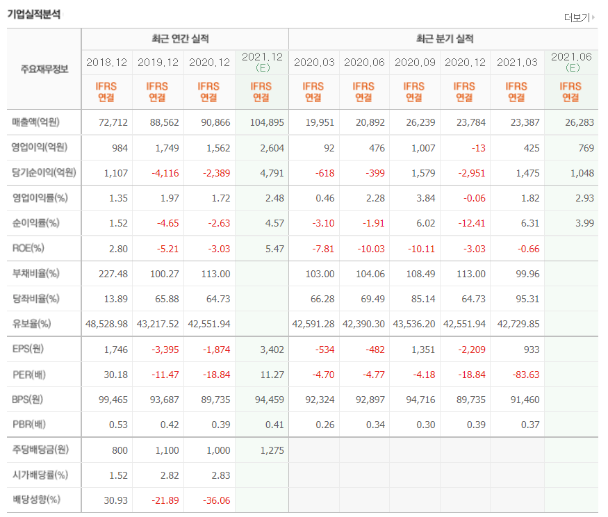 - 2021년 3월 전년동기 대비 연결기준 매출액은 17.2% 증가, 영업이익은 363.9% 증가, 당기순이익 흑자전환.