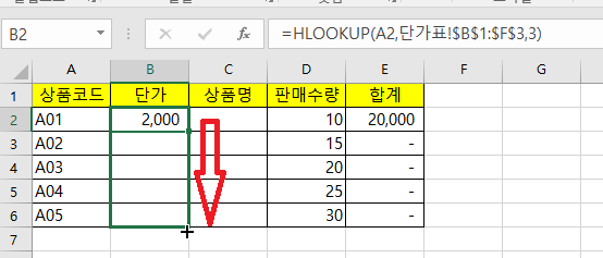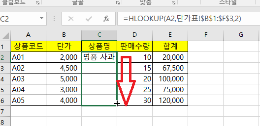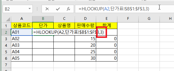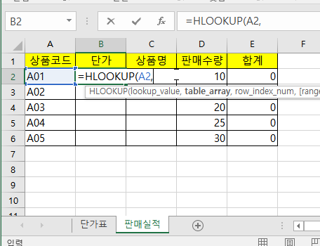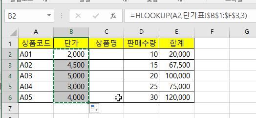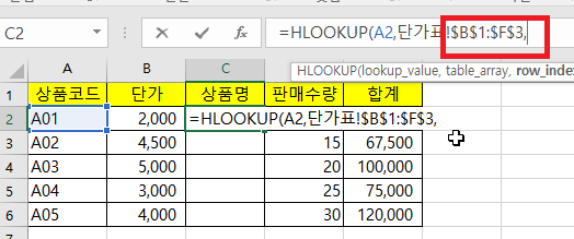 그러면 단가에 셀을 선택하고 =Hlookup( 을 입력 후 상품코드를 선택하고 콤마(,)를 입력하여 줍니다.