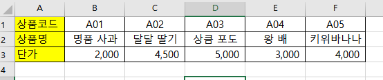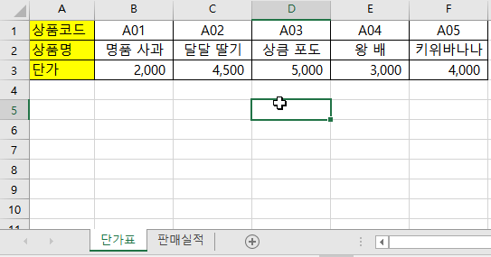 먼저 가로로 되어있는 단가표를 만들고, 판매실적표를 만들어 보겠습니다. 판매실적표에 열은 순서만 바꾸었고, 판매수량과 합계는 미리 계산해두었습니다.