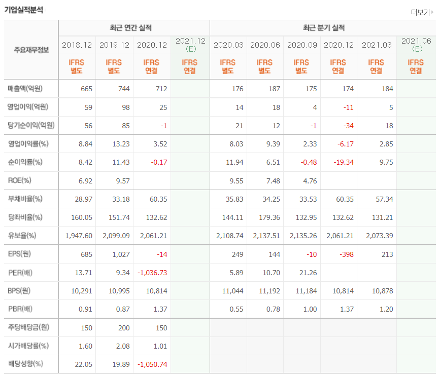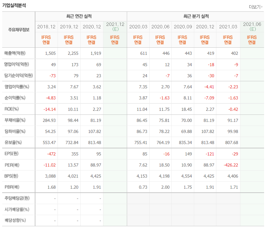 - 2021년 3월 전년동기 대비 연결기준 매출액은 20.8% 감소, 영업이익 적자전환, 당기순이익 적자전환.