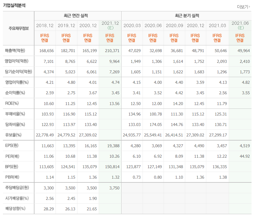 - 2021년 3월 전년동기 대비 연결기준 매출액은 7.7% 증가, 영업이익은 7.4% 증가, 당기순이익은 19.2% 감소.