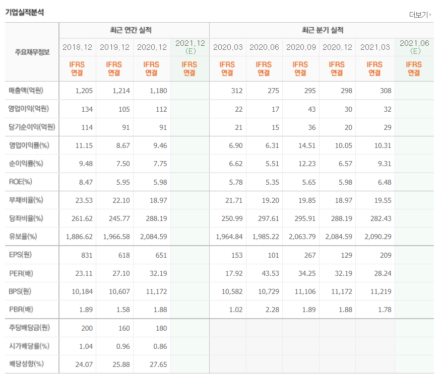 - 2021년 3월 전년동기 대비 연결기준 매출액은 6.6% 감소, 영업이익은 65.6% 감소, 당기순이익은 3.2% 증가.