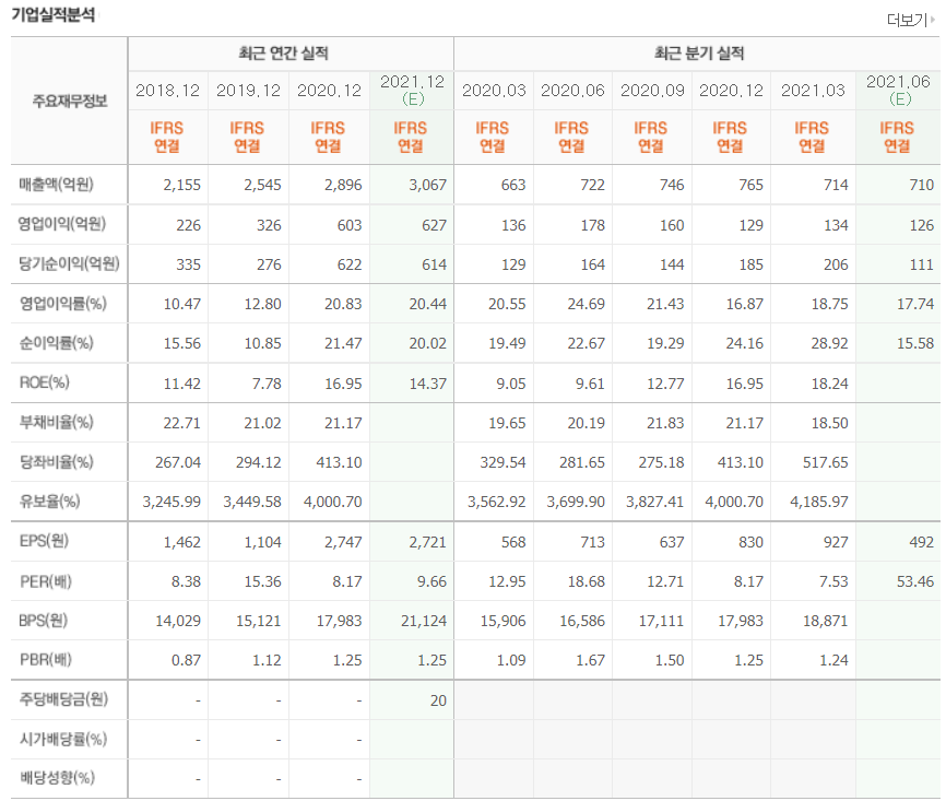 - 2021년 3월 전년동기 대비 연결기준 매출액은 7.7% 증가, 영업이익은 1.7% 감소, 당기순이익은 64% 증가.