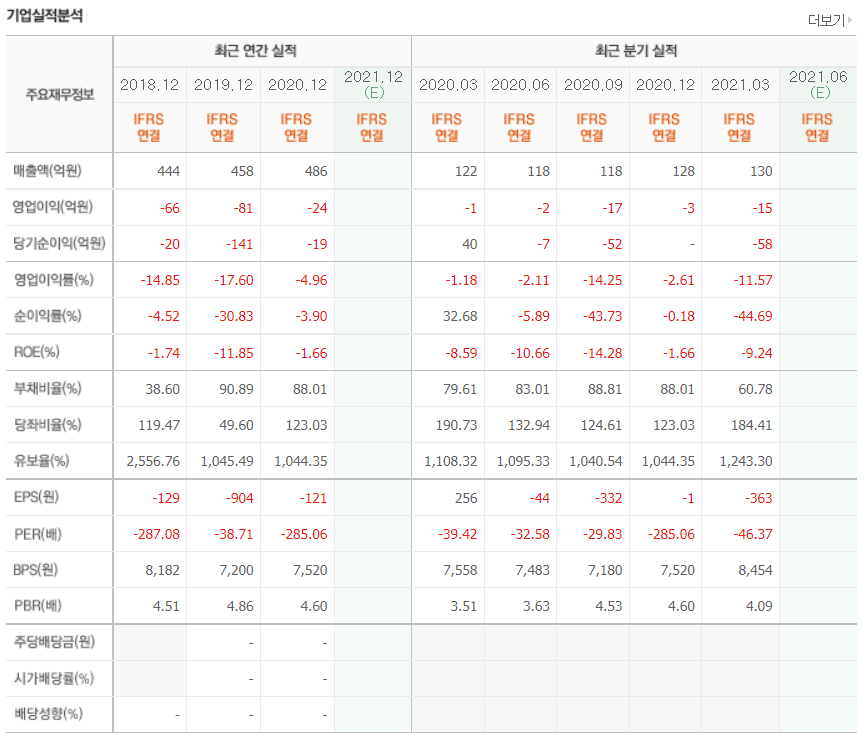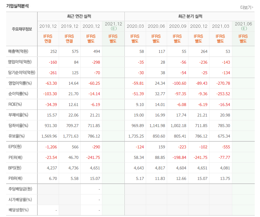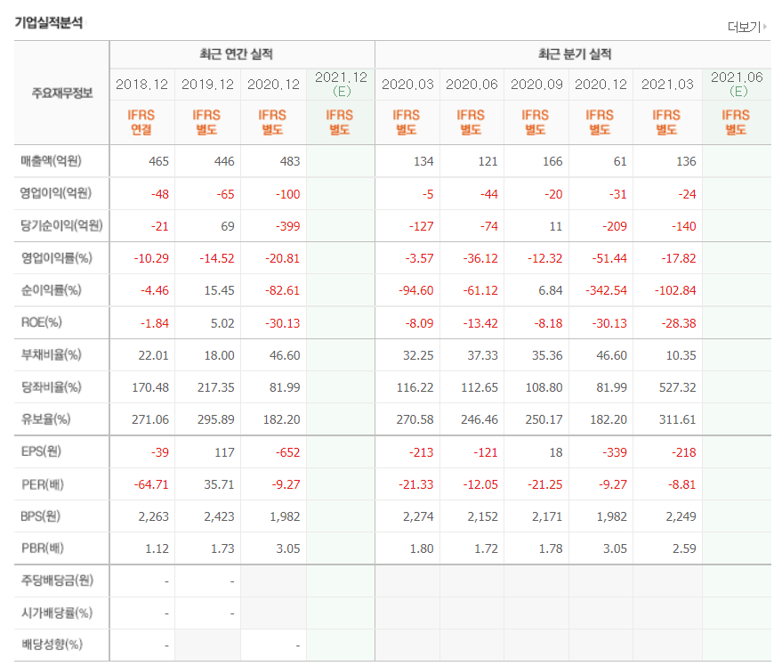 - 2021년 3월 전년동기 대비 별도기준 매출액은 8.9% 감소, 영업손실은 312.3% 증가, 당기순손실은 349.3% 증가.