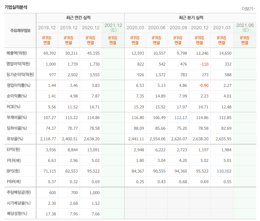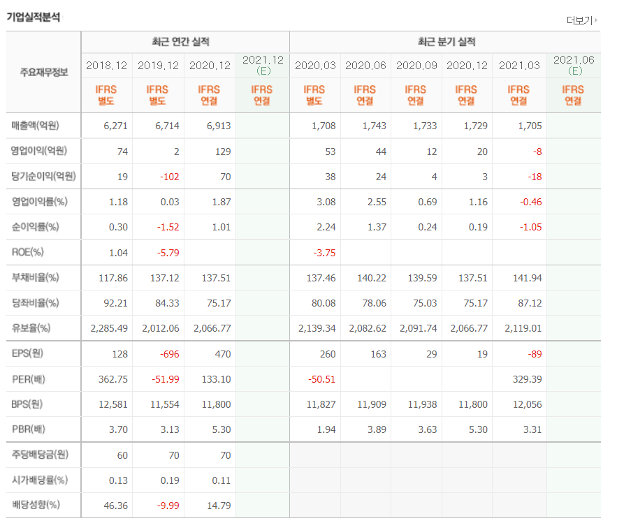 - 2021년 3월 전년동기 대비 연결기준 매출액은 0.2% 감소, 영업이익 적자전환, 당기순이익 적자전환.