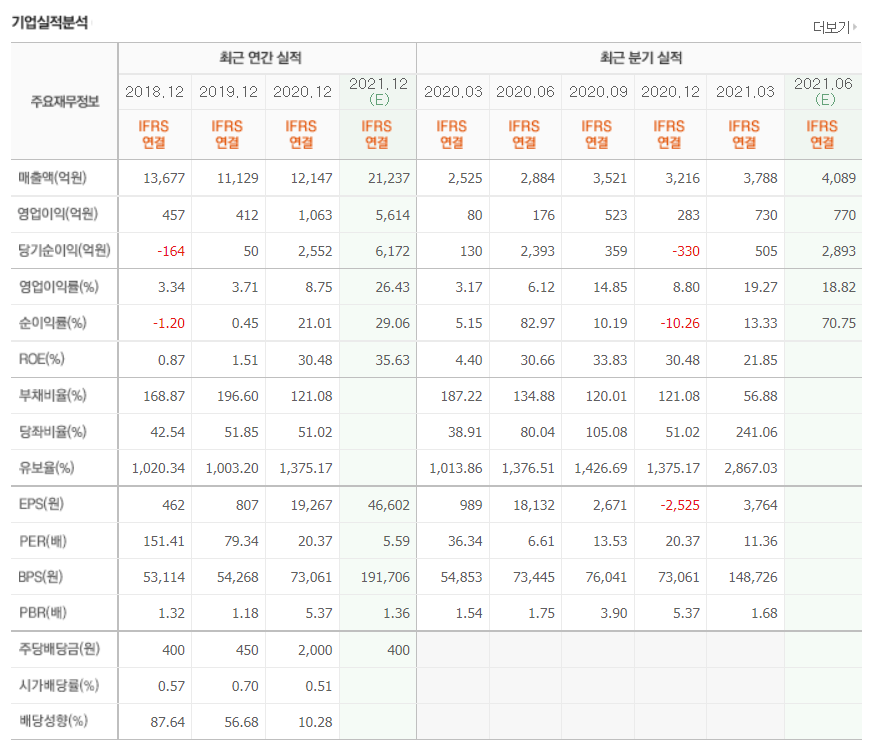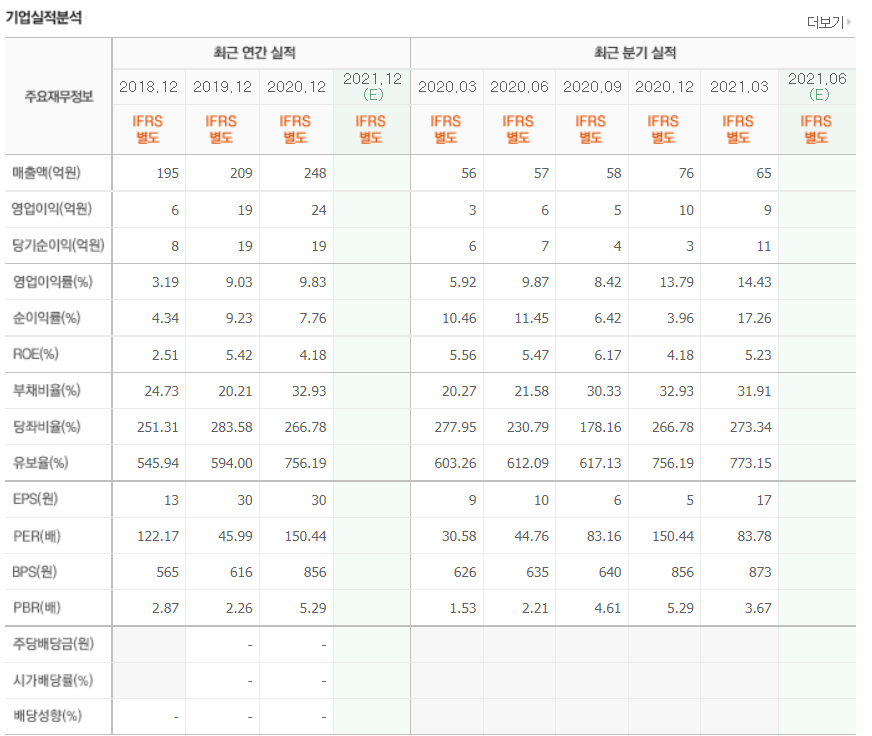 - 2021년 3월 전년동기 대비 별도기준 매출액은 422.4% 증가, 영업이익 흑자전환, 당기순이익 흑자전환.