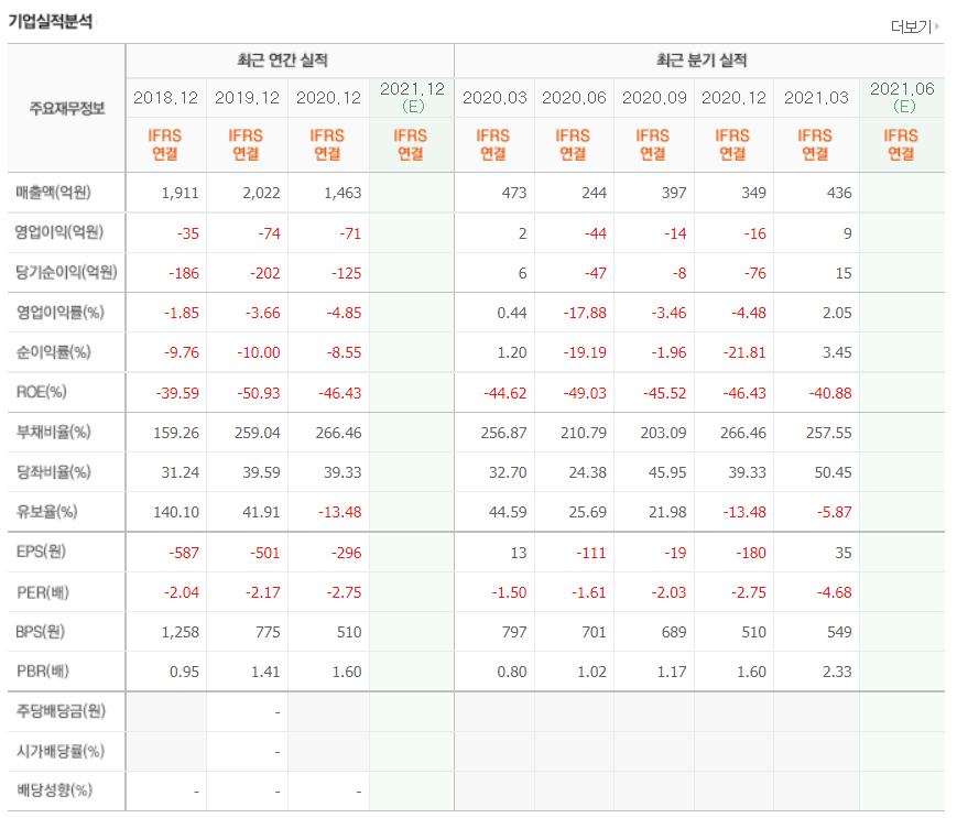 - 2021년 3월 전년동기 대비 연결기준 매출액은 56.9% 증가, 영업손실은 91.5% 증가, 당기순손실은 5890% 증가.
