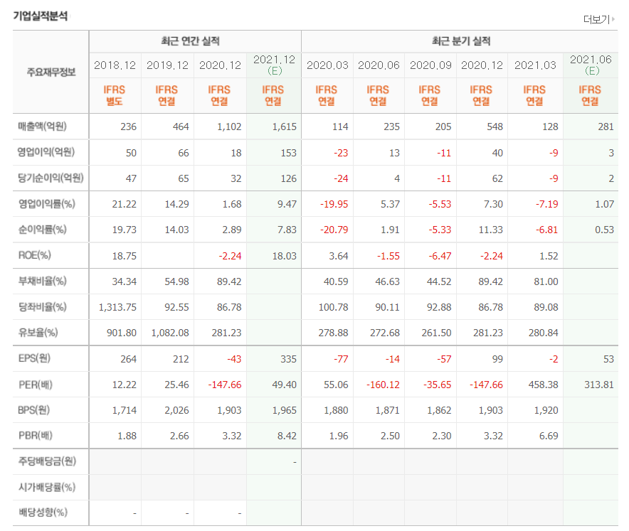 - 2021년 3월 전년동기 대비 연결기준 매출액은 111.2% 증가, 영업손실은 44.6% 감소, 당기순손실은 1144.3% 증가.