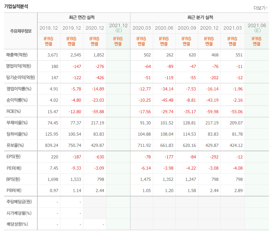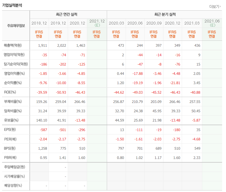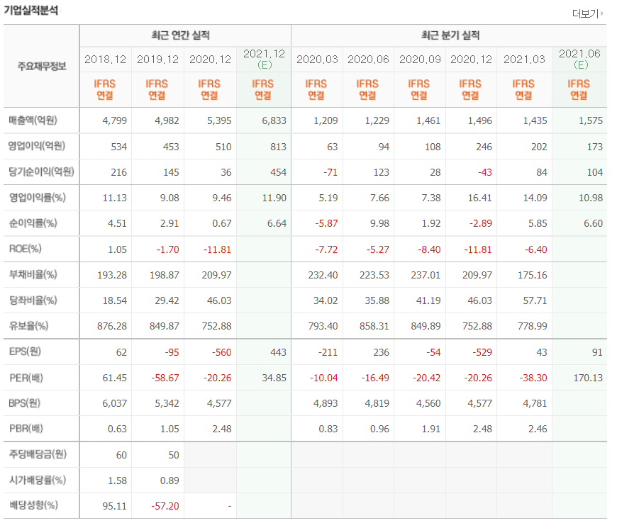 - 2021년 3월 전년동기 대비 연결기준 매출액은 56.9% 증가, 영업손실은 91.5% 증가, 당기순손실은 5890% 증가.