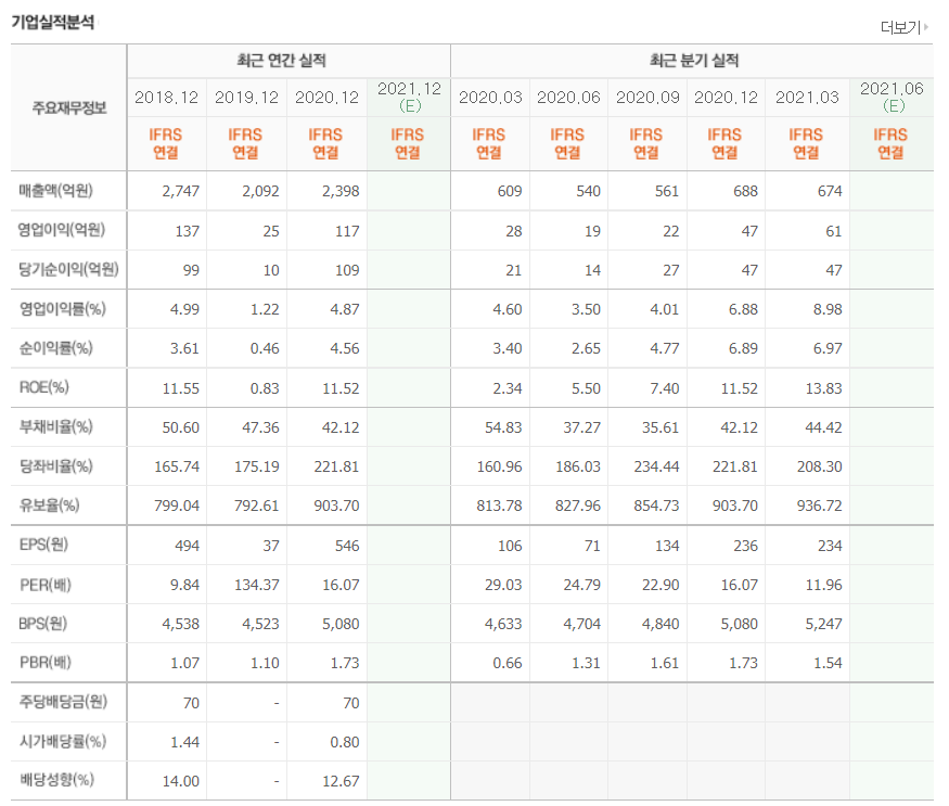 - 2021년 3월 전년동기 대비 연결기준 매출액은 7.8% 감소, 영업이익은 324.8% 증가, 당기순이익은 166% 증가.
