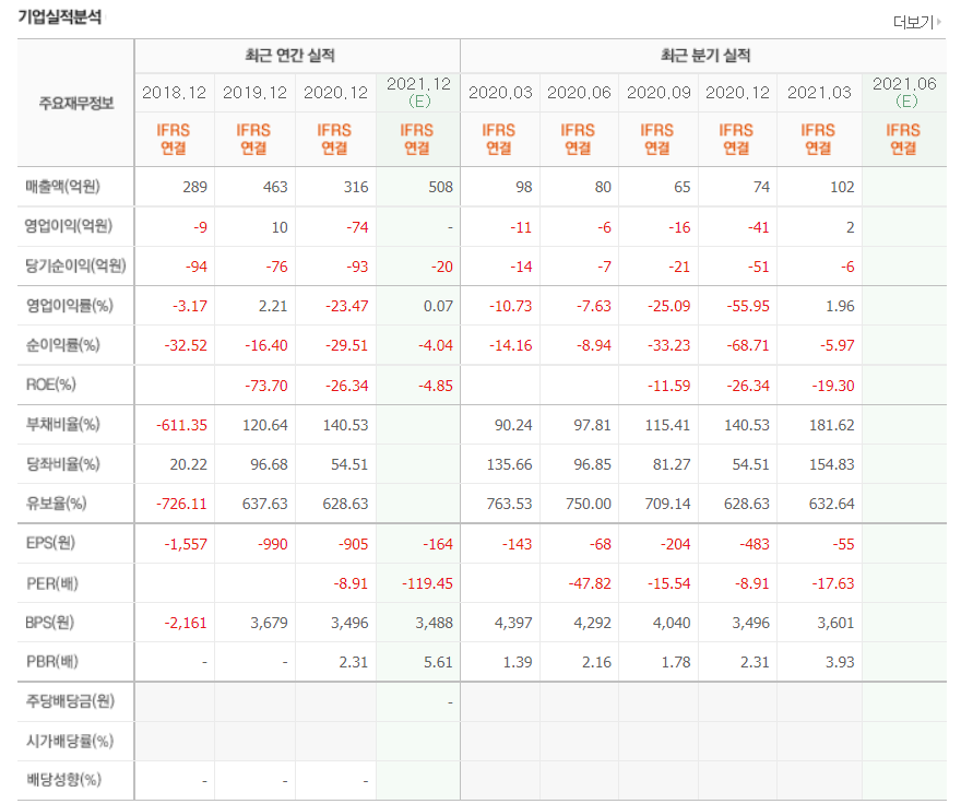 - 2021년 3월 전년동기 대비 연결기준 매출액은 10.5% 감소, 영업손실은 16% 감소, 당기순손실은 87.4% 감소.