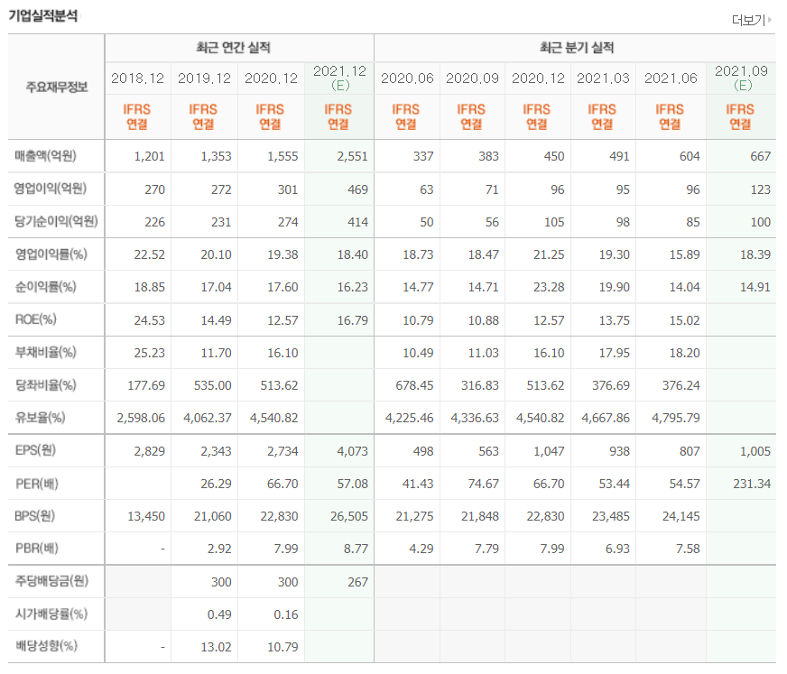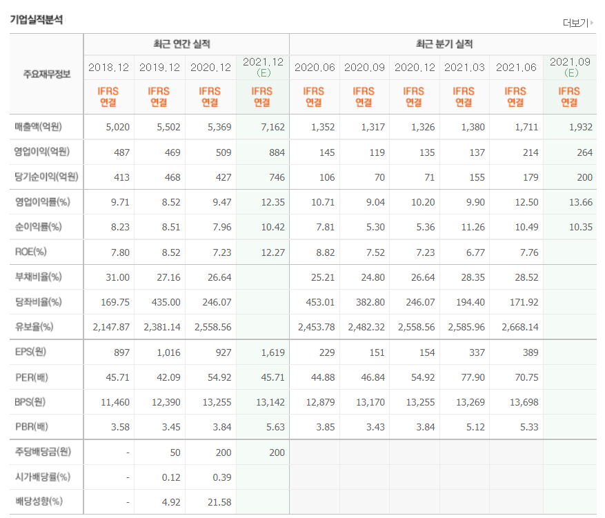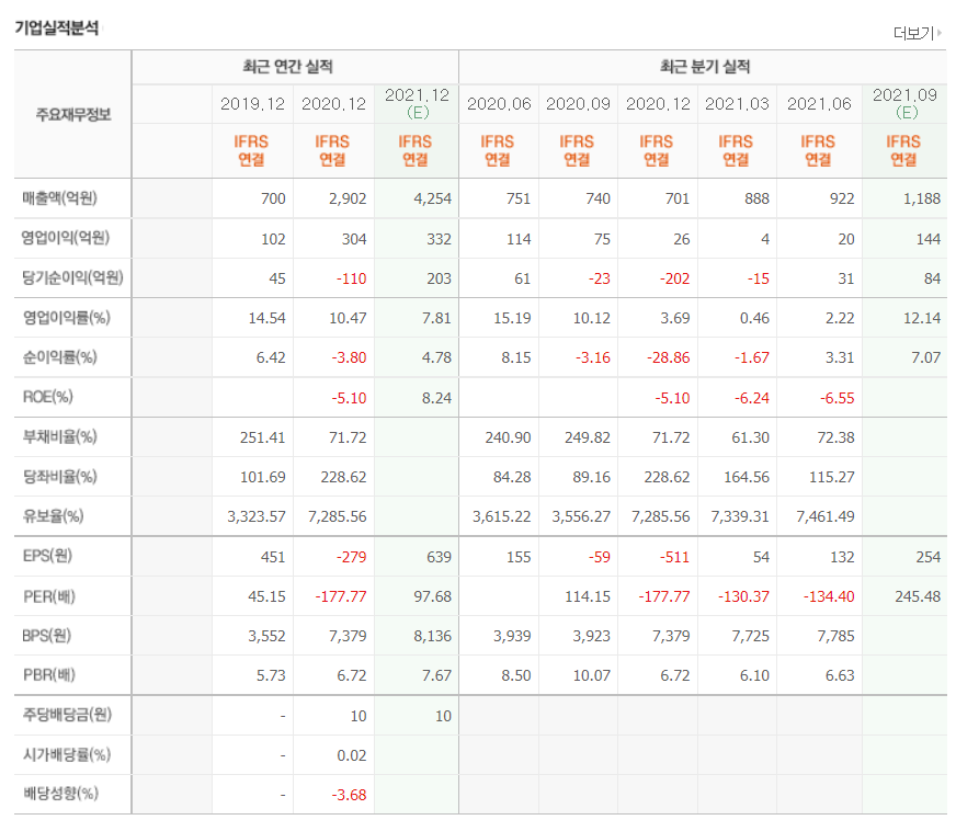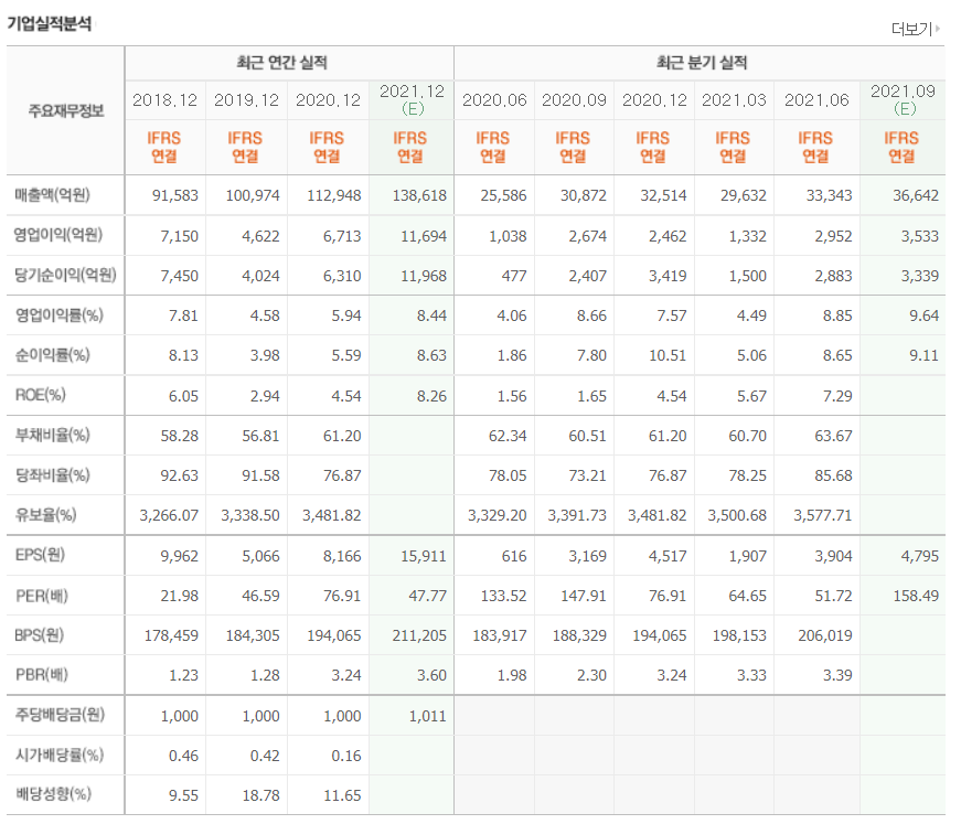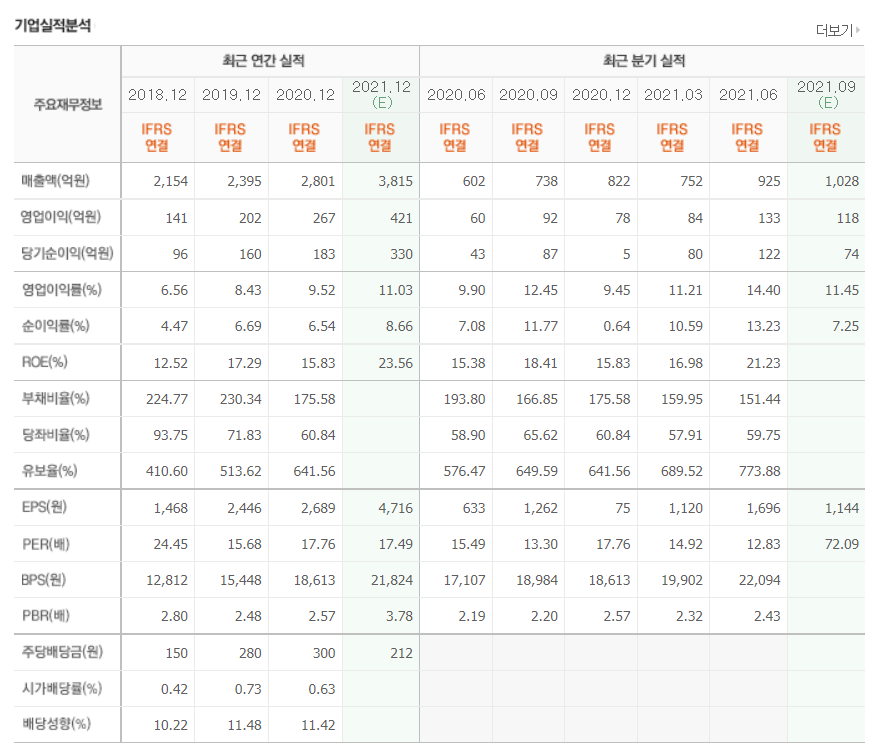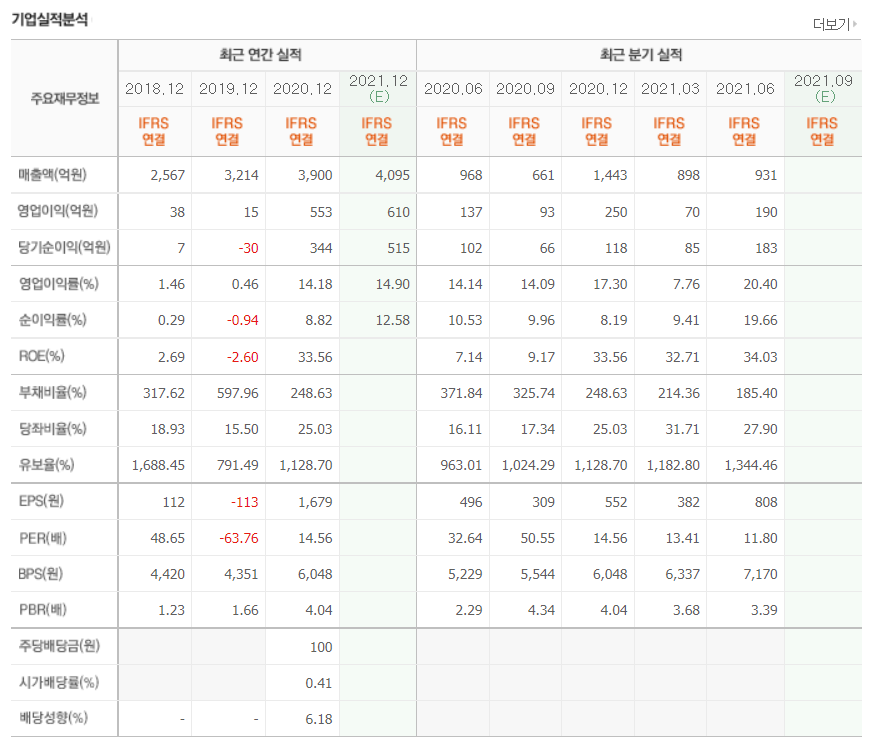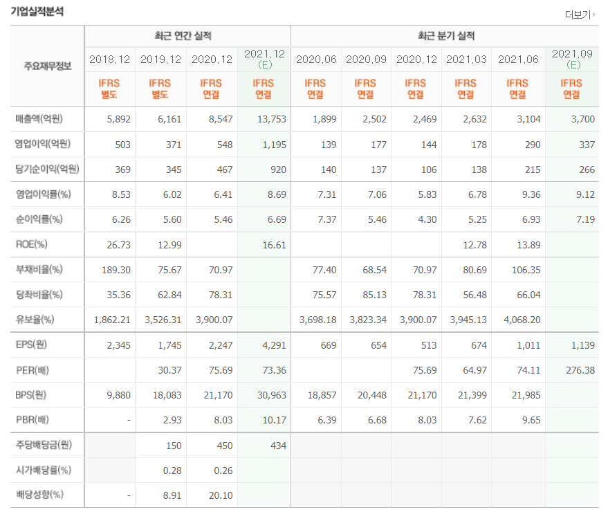- 2021년 6월 전년동기 대비 연결기준 매출액은 54.5% 증가, 영업이익은 356.3% 증가, 당기순이익은 593.4% 증가.