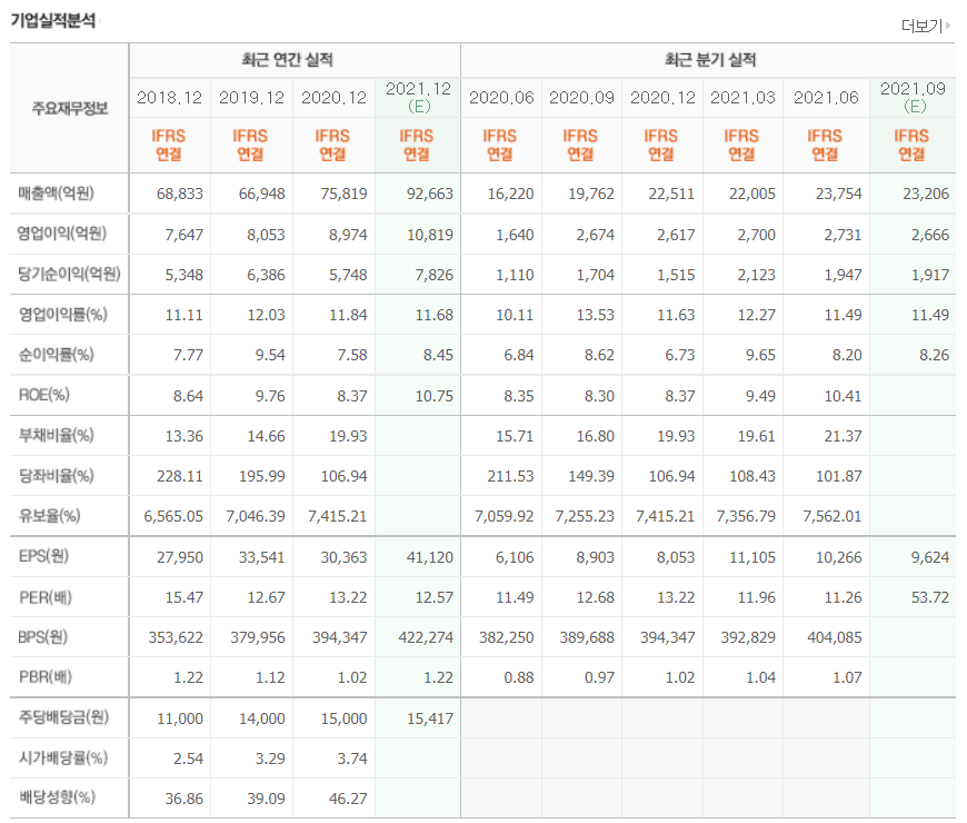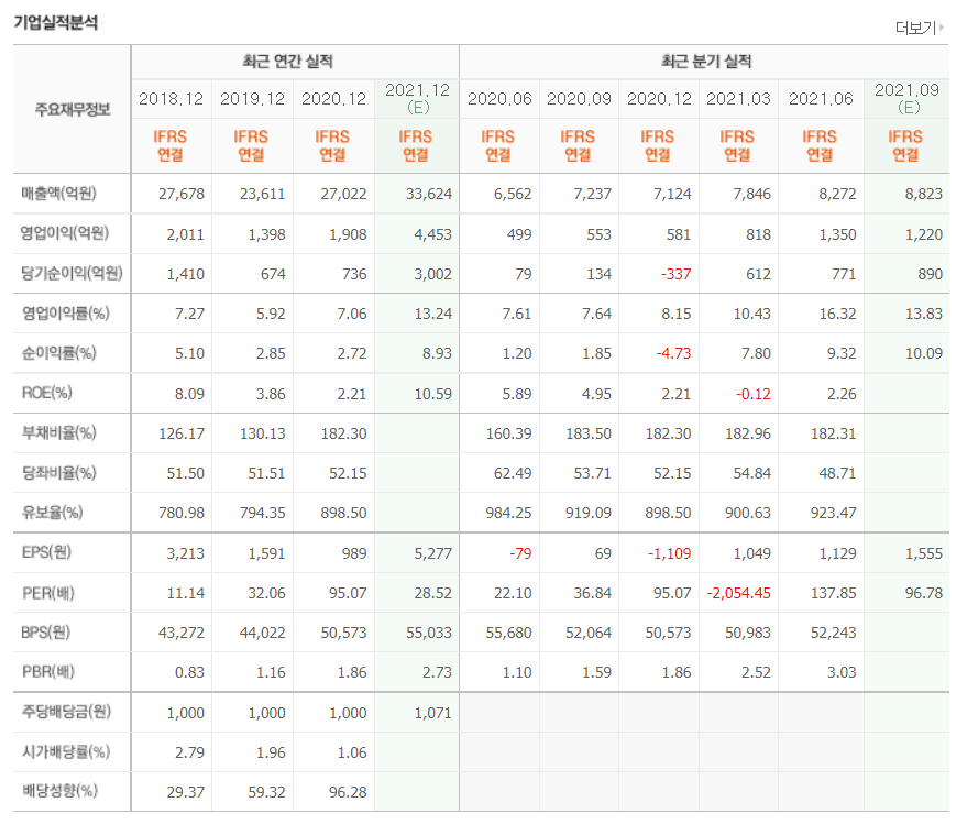 - 2021년 3월 전년동기 대비 연결기준 매출액은 14.9% 증가, 영업이익은 84.6% 증가, 당기순이익 흑자전환.