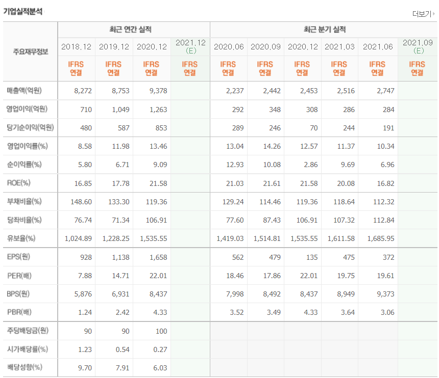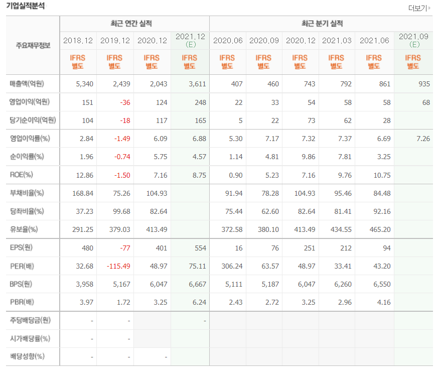 - 2021년 3월 전년동기 대비 별도기준 매출액은 83.3% 증가, 영업이익은 279.5% 증가, 당기순이익은 258% 증가.