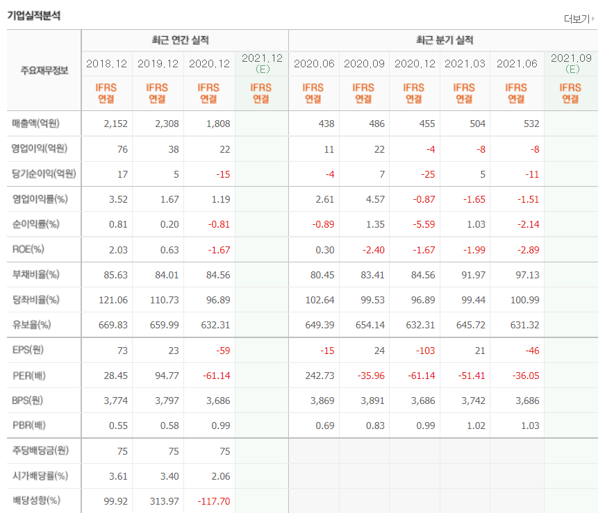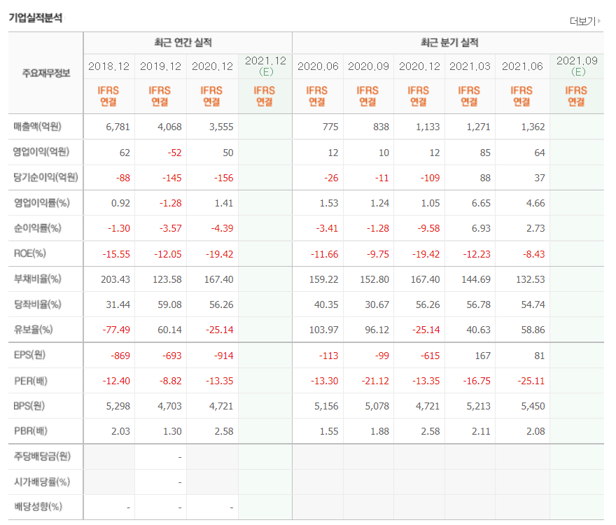 - 2021년 3월 전년동기 대비 별도기준 매출액은 91.8% 감소, 영업이익 적자전환, 당기순손실은 75% 감소.