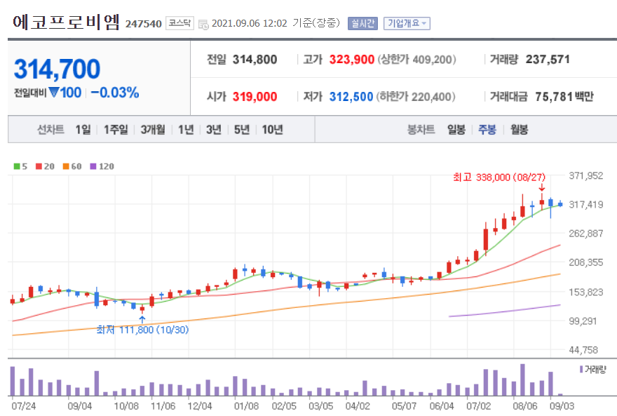 글로벌 2위 양극재 제조사, 양극활물질을 생산하여 사업을 영위하고 있다. 최근 에코프로비엠의 주가 하늘을 찌를듯하고 있는 가운데 에코프로비엠의 차트와 실적등을 아래에서 확인해보세요.