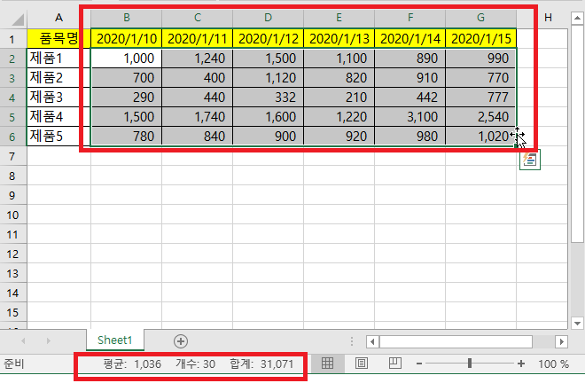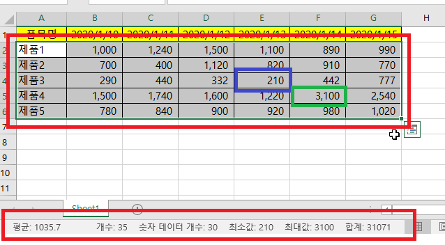 두개이상의 데이터가 있는 셀을 선택한다면, 하단에 상태 표시줄에 평균, 개수, 합계가 표시됩니다.