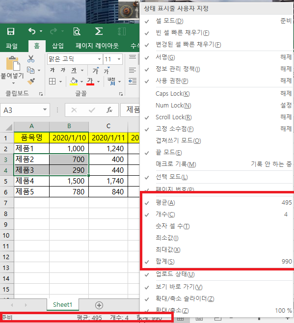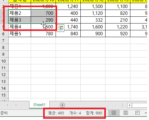 평균과 합계는 선택된 셀 중 숫자 데이터가 있는 셀만 체크가 됩니다. 아래 이미지를 보시면 "제품2"와 "제품3" 셀과 숫자데이터가 있는 700, 290을 같이 선택하였는데, 평균은 700+290 / 2 = 495 가 나왔으며, 합계는 700+ 290을 더한 990이 나왔습니다.