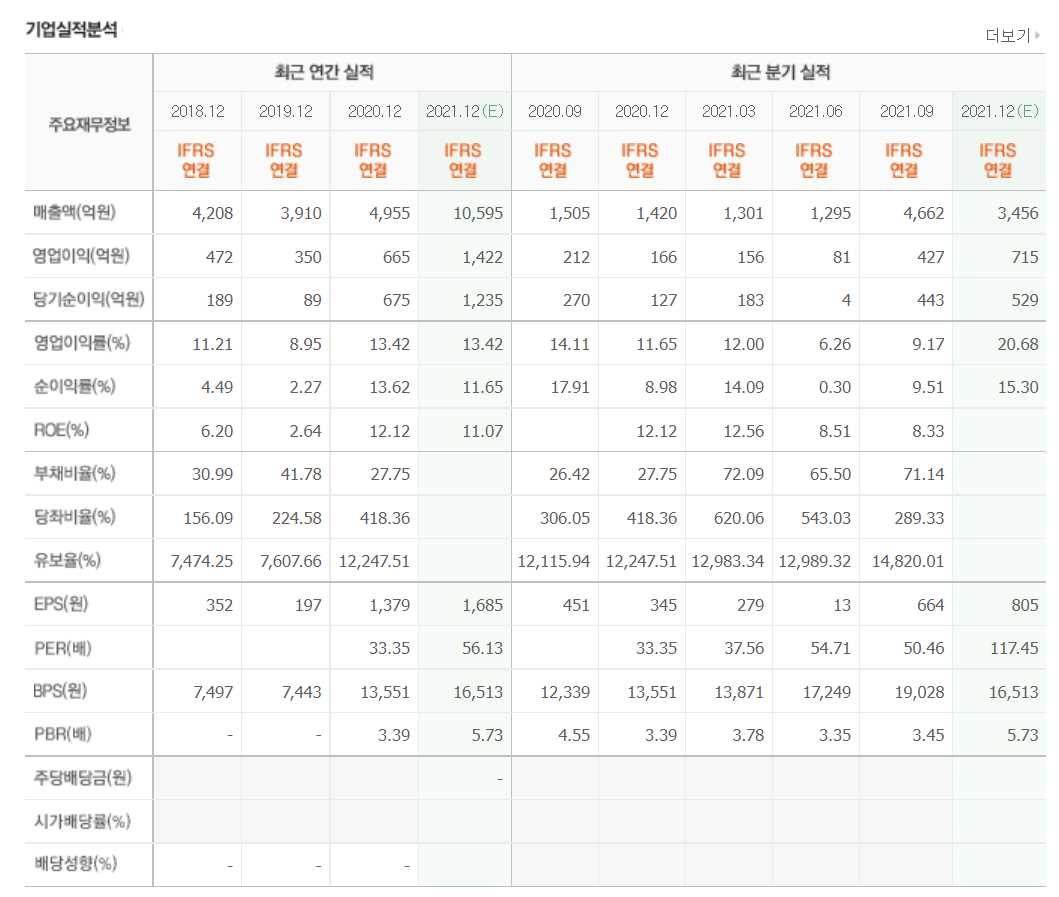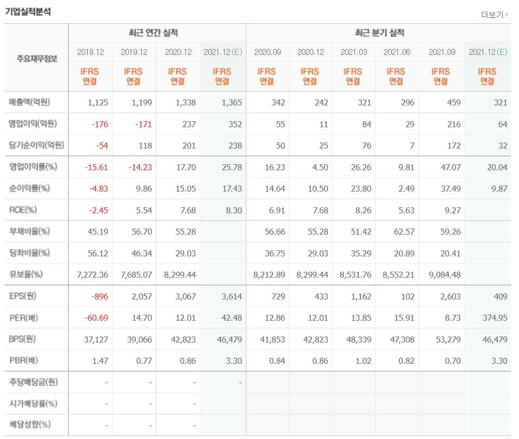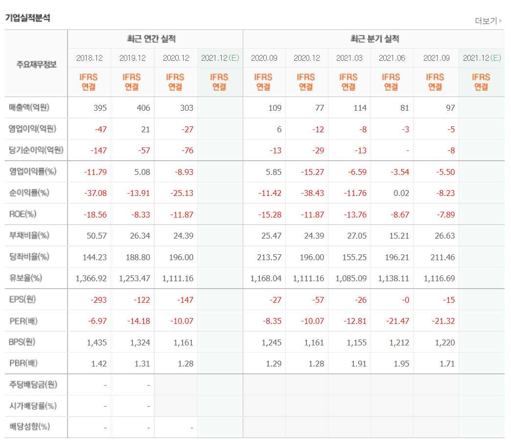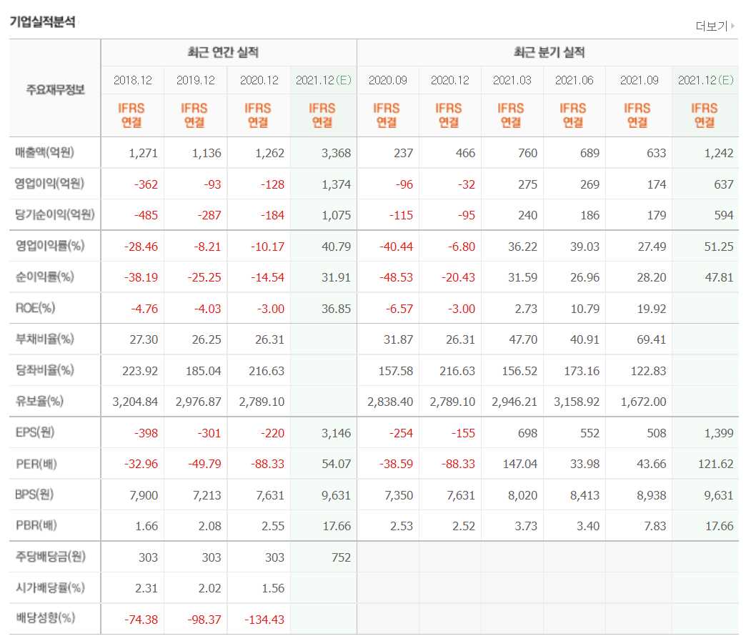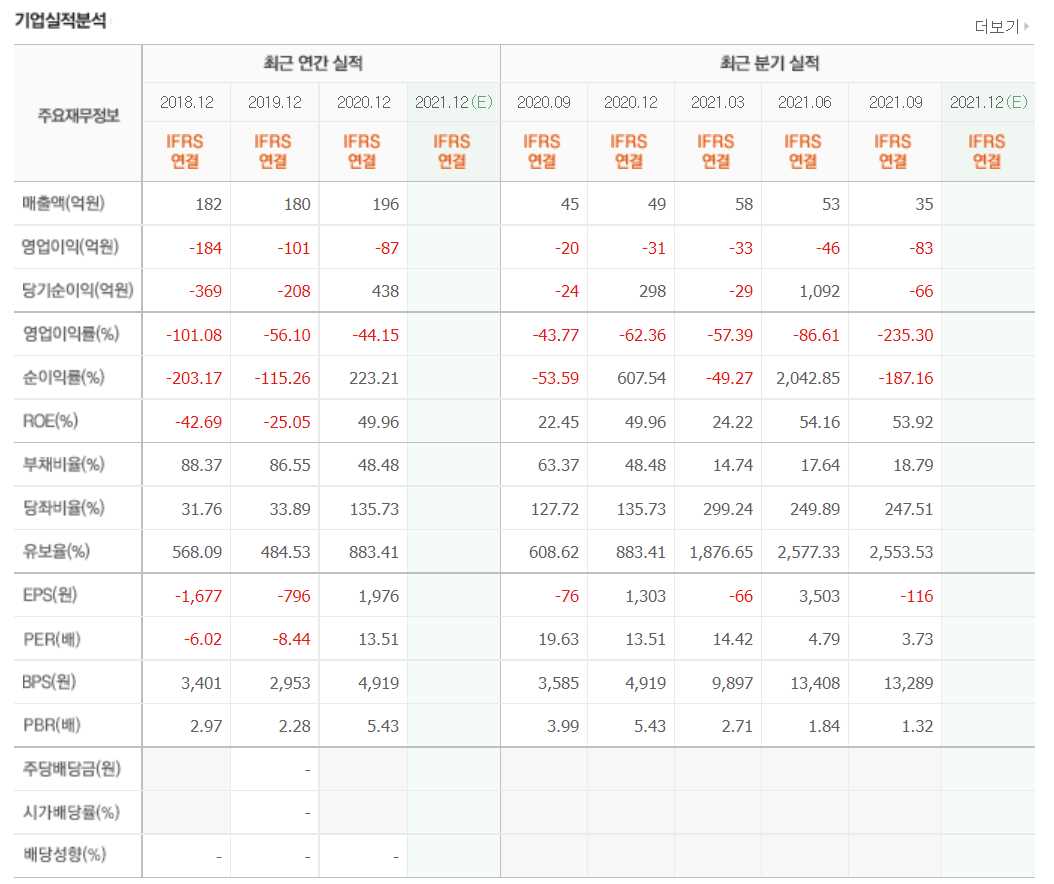 - 2021년 6월 전년동기 대비 연결기준 매출액은 1809.5% 증가, 영업손실은 71.7% 감소, 당기순이익 흑자전환.