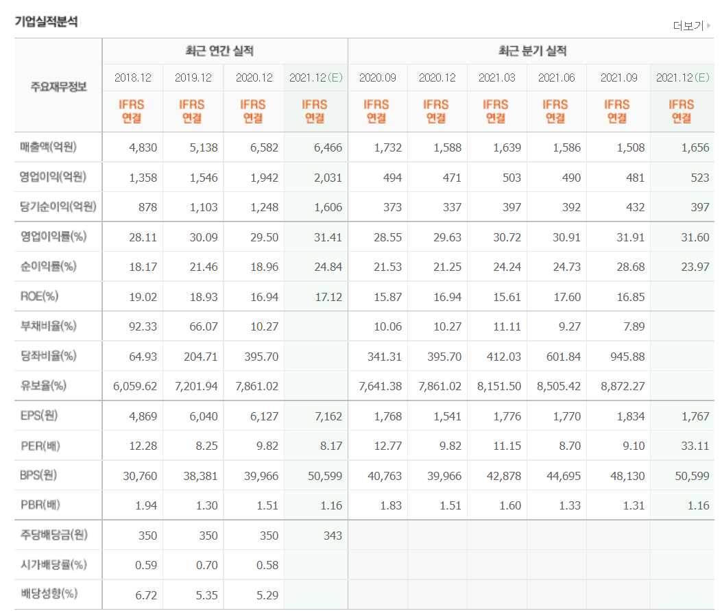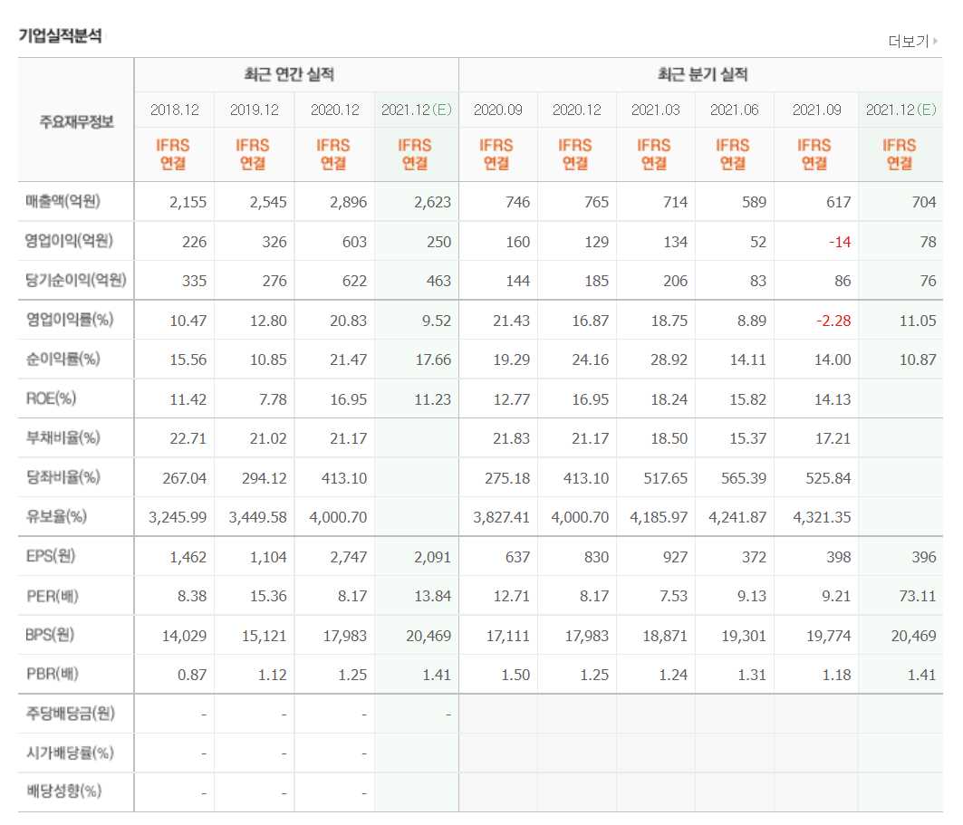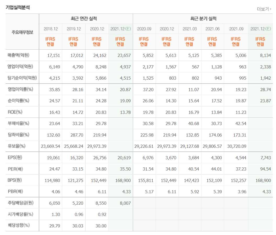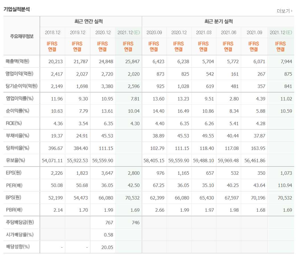 - 2021년 9월 전년동기 대비 연결기준 매출액은 5.7% 감소, 영업이익은 48.8% 감소, 당기순이익은 37.9% 감소.