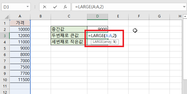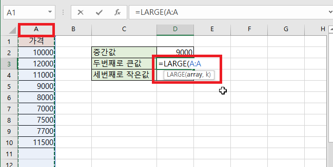 =LARGE( 를 입력한뒤 가격이 있는 A열을 선택하여 줍니다.