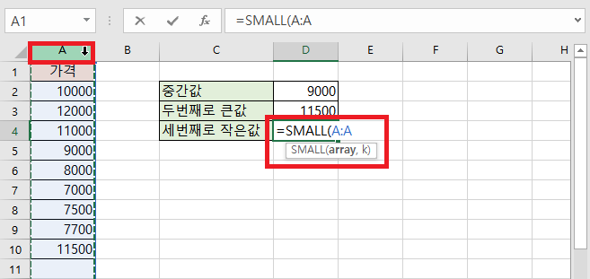 =SMALL( 을 입력 후 A열을 선택하여줍니다.