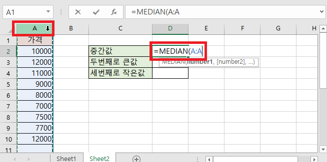 =MEDIAN( 를 입력하여주고 가격 데이터가있는 A열을 선택하여 줍니다.