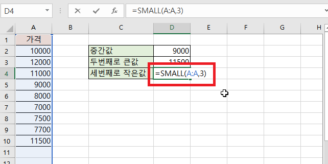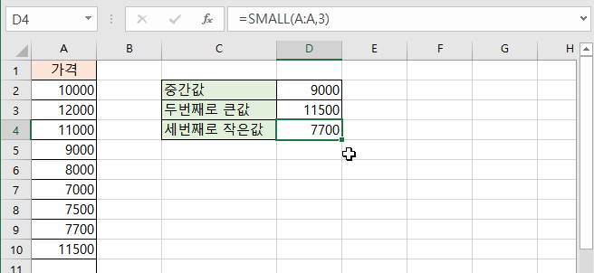 마지막으로 세번째로 작은 값을 구해보겠습니다. 작은 값을 구하는 함수는 SMALL을 사용합니다.