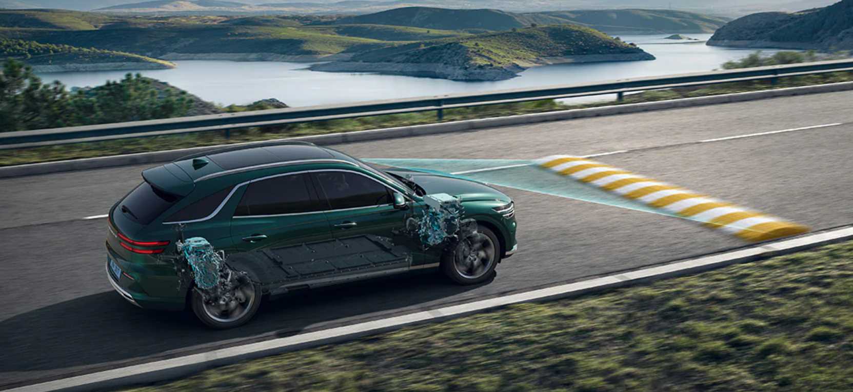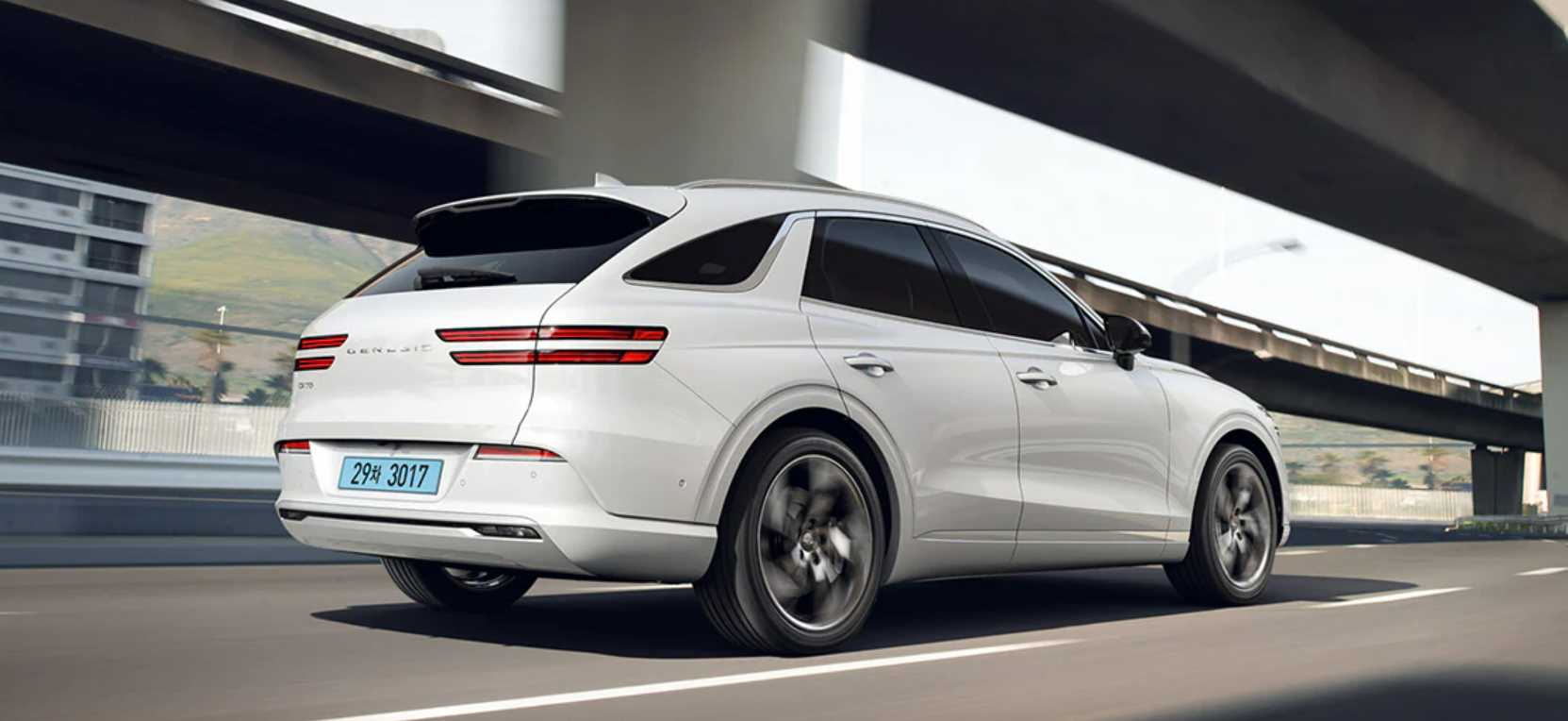 제네시스 GV70 전기차는 77.4kWh 배터리로 1회 완충시 400km를 주행할 수 있으며, 프리뷰 전자제어 서스펜션과 능동형 소음 제어기술 등 고급 사양이 기본으로 적용되었다.