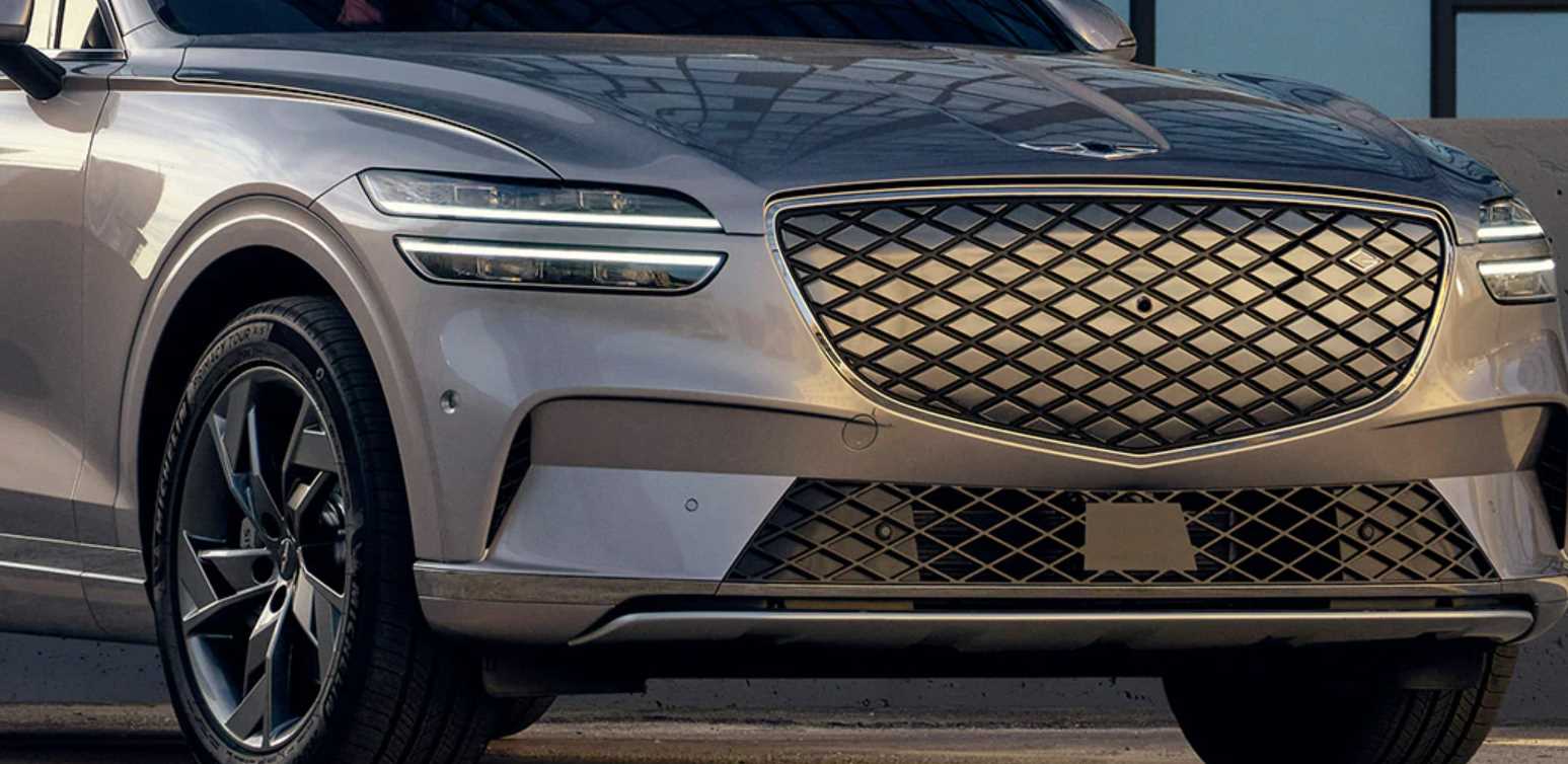 GV70 전기차 외관의 전면부 그릴은 공기역학적 효율을 고려하여 전기차 전용 G-Matrix 패턴으로 고유의 전기차 이미지를 표현하였으며, 그릴 상단에 위치한 충전구는 닫았을 때 경계가 드러나지 않아서 깔끔하며 그릴의 일부처럼 표현이 되었다.