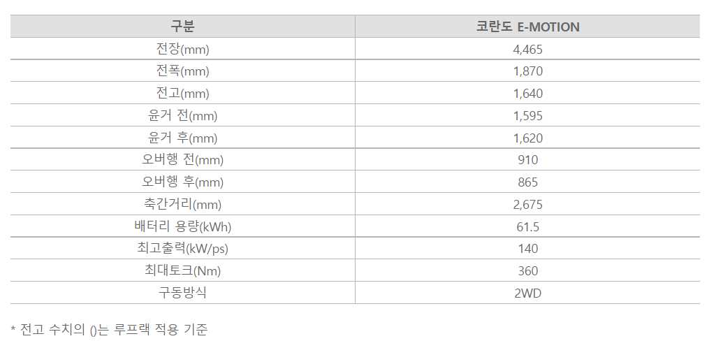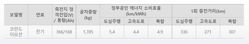 2022 코란도 이모션은 61.5kWh 배터리가 장착되며, 1회 충전 주행거리가 307km입니다. 가격경쟁력이 있으나 다른 전기차 모델 대비 주행거리가 짧은 편이라 아쉬울 수 있습니다.