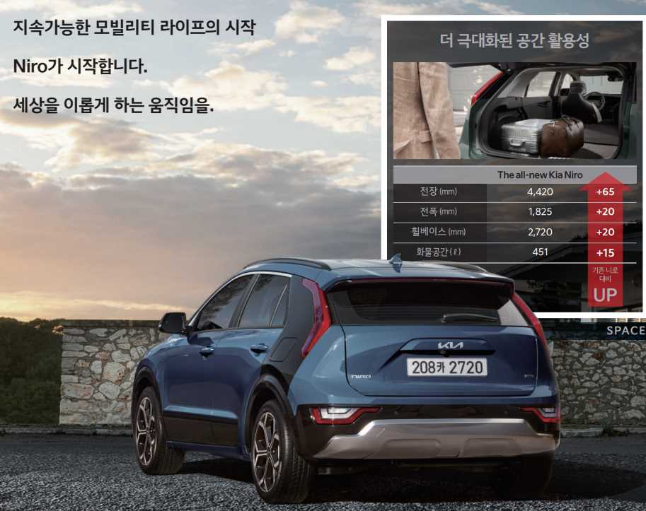이에 따라서 신형 니로는 이전 모델과 비교하여 전장 65mm, 전폭 20mm, 전고 10mm, 축거 20mm 사이즈가 커졌습니다.
