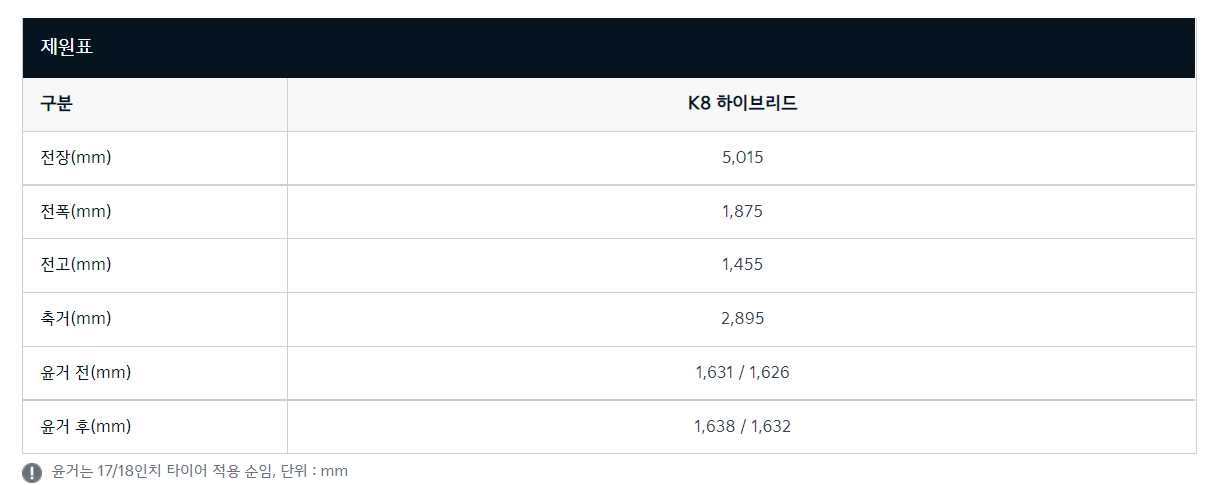 2023년형 K8 하이브리드는 전장 5,015mm, 전폭 1,875mm, 전고 1,455mm, 축거 2,895mm의 제원을 가지고 있습니다.
